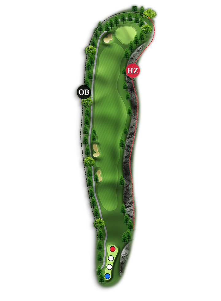 • Par3홀입니다. 깃대가 그린 중앙이나 왼쪽에 있을 때는 깃대를 바로 공략하셔도 괜찮지만, 오른쪽에 깃대가 있다면 약간의 슬라이스로 벙커나 해저드 위험이 있으므로 깃대보다 약간 왼쪽으로 공략하는 것이 좋습니다.